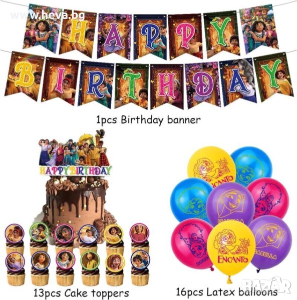 Парти комплектът включва 16 балона, 1 банер Честит рожден ден и 13 топера за торта или мъфини, както и въже за окачане