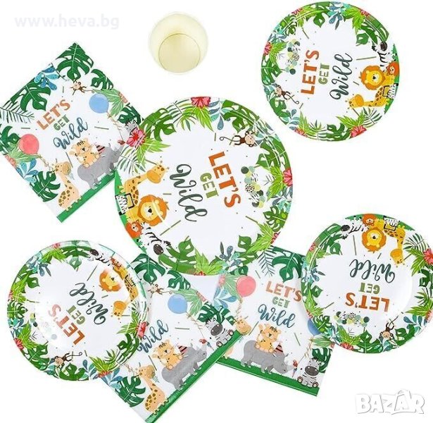 в джунглата включва 16 бр. 40x22см. хартиени чинии, 16 бр. 40х17см. хартиени чинии, 16 салфетки,
