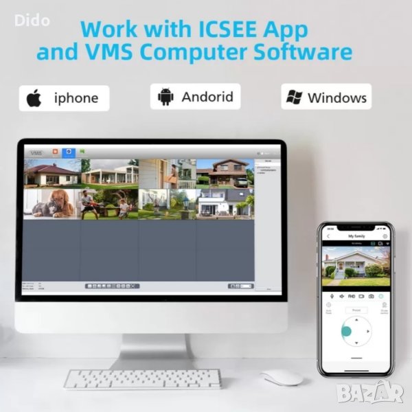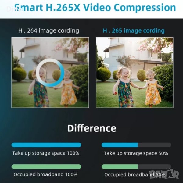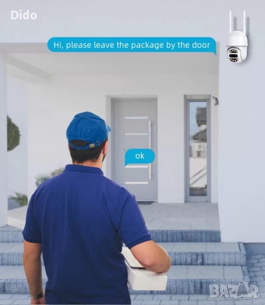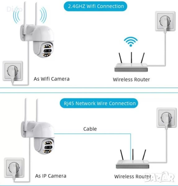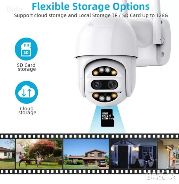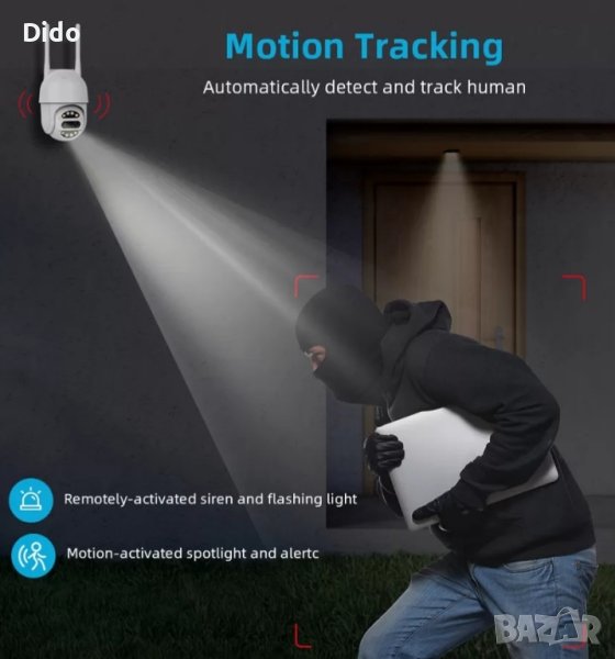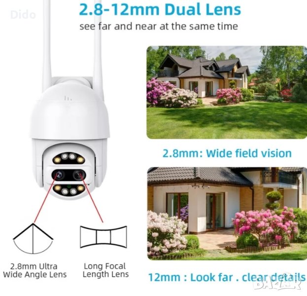 Интелигентна панорамна камера- две лещи и оптичен зуум изпраща нотификации при засичане на движение и звук, директно на смартфона, чрез приложението с което работи. Автоматичен нощен режим.