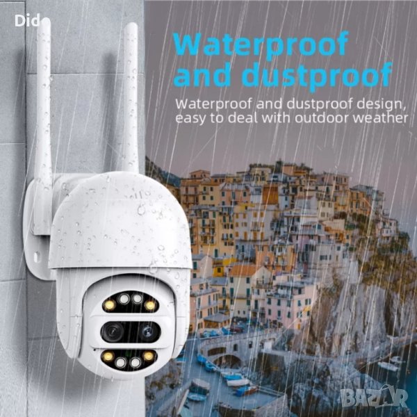 Wifi камерата Dual Lens PTZ e водоустойчива и е подходяща за външни условия, може да се настрой и монтира за няколко минути, без необходимост от допълнителни устройства или кабели. Защитата за водоустойчивост е IP66.