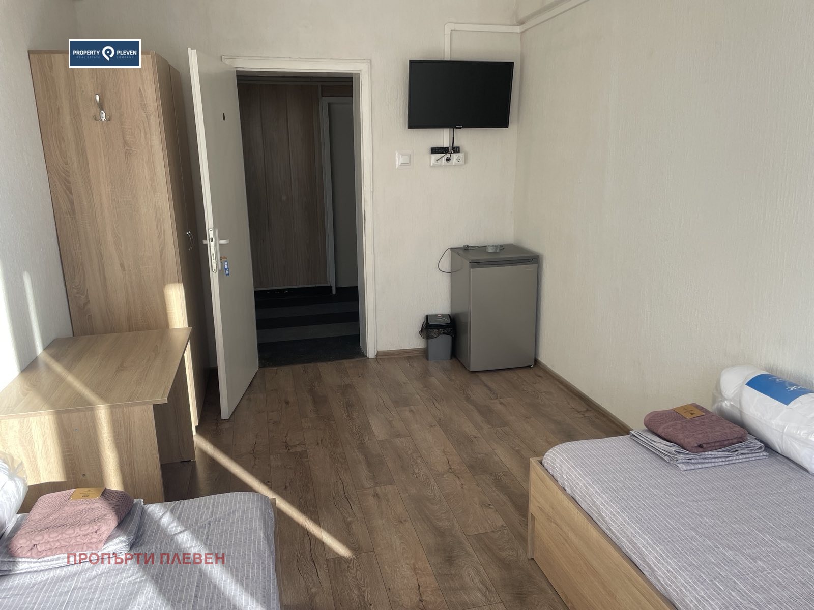 Оферта 30559. Хостелът е разположен в индустриалната зона на гр. Плевен по пътя за Метро. Сградата е с ограничен достъп, жива охрана, видеонаблюдение, безплатен паркинг, WI-FI, отопление и охлаждане с термопомпа. Предлагаме напълно оборудвани 13 двойни и една четворна стаи, всяка с телевизор, хладилник, маса, гардероб, нови матраци и хавлии. На етажа има трапезария, 7 бани, 6 тоалетни, и перално помещение с всичко необходимо, перални и сушилни, сгъваеми сушилници, ютии и гладачни дъски. Преференциални цени за фирми, големи бригади и редовни клиенти. За повече информация на тел. 0899955590