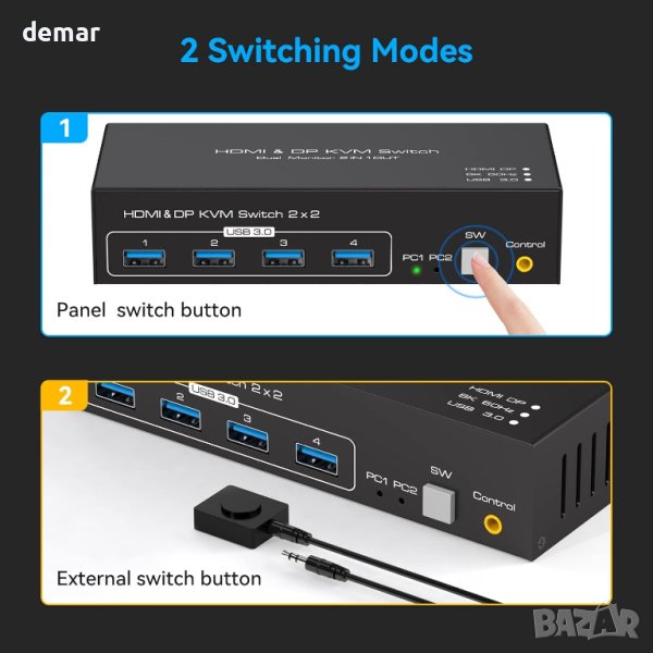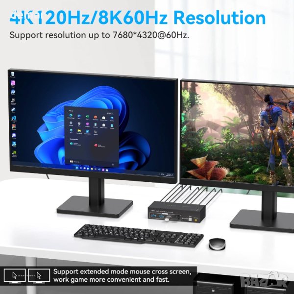 KVM превключвателят с поддръжка за два монитора (DP+HDMI) ви позволява да свържете два компютърни хоста и да споделяте един комплект клавиатура и мишка с два монитора. Той предлага разширен режим или режим на дублиране за компютърни хостове, осигурявайки гъвкавост за различни настройки на дисплея. KVM превключвателят поддържа дисплеи с висока разделителна способност до 8K60Hz и 4K120Hz, с USB 3.0 портове за бърз трансфер на данни. Можете да превключвате между компютри с помощта на бутон за кабелно разширение или бутон с едно докосване, което го прави удобно и ефективно. Моля, обърнете внимание, че графичната карта на компютъра ви трябва да поддържа два или няколко монитора за пълна функционалност.
