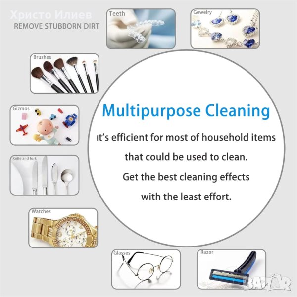 Ултразвуков почистващ уред за бижута: Този ултразвуков почистващ уред с висока честота на вибрация от 45 KHZ може лесно и бързо да отлепи мръсотията в слепите зони, като празнини и канали. Само за 3-5 минути вашето бижу или очила ще изглеждат чисто нови.