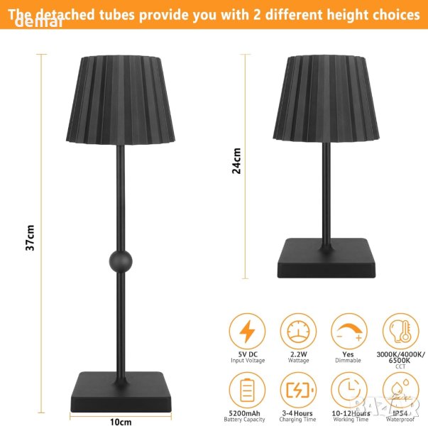 Тази преносима безжична лампа предлага най-доброто удобство със своя безжичен дизайн и мощна 5200mAh акумулаторна батерия, осигуряваща 10-20 часа светлина с едно 5-6 часово зареждане, заедно с USB-C кабел и индикатори за зареждане. С 3-цветни температурни настройки (2700K, 4000K, 6500K) и безстепенно затъмняване от 5%-100%, е лесно да персонализирате вашето осветление за всяка настройка. Елегантният, минималистичен алуминиев дизайн на лампата с матово покритие и противоплъзгаща се силиконова основа добавя елегантност и стабилност. Той разполага с 360° кръгъл светлинен източник за равномерно, приятно за очите осветление, без трептене и отблясъци. В допълнение, рейтингът за водоустойчивост IP54 гарантира издръжливост както за вътрешна, така и за външна употреба, което го прави универсален избор за всяка среда.