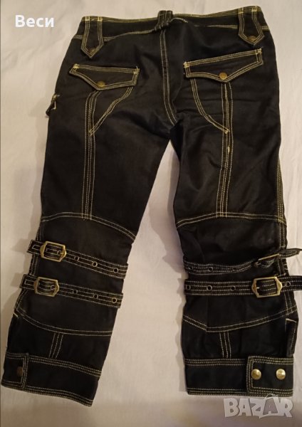 Панталона е до под коляното за ботуш. Жесток модел. Материята е доста плътна 100% памук, наситено черно с бежови шевове.