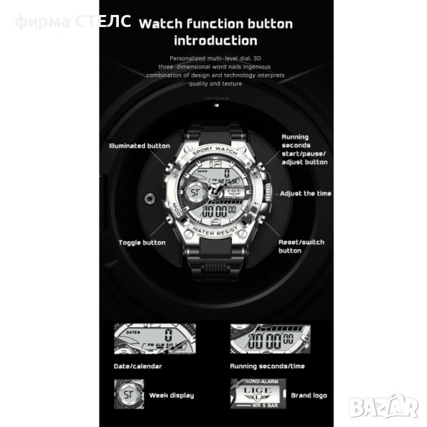 Функции - Час, Минути, Секунди, Дата, Ден от седмицата, Хронограф, Хронометър, Показва 24 ч