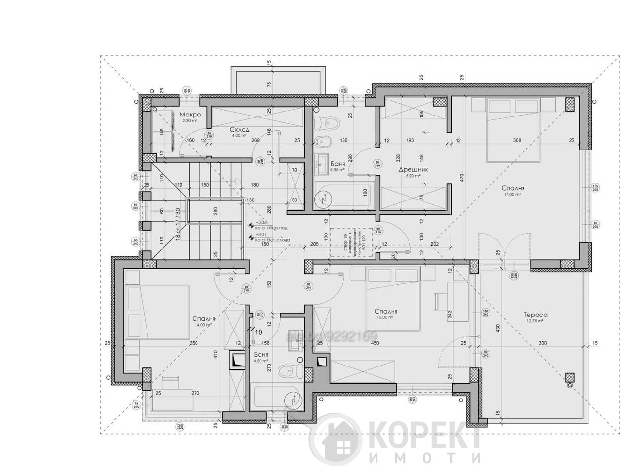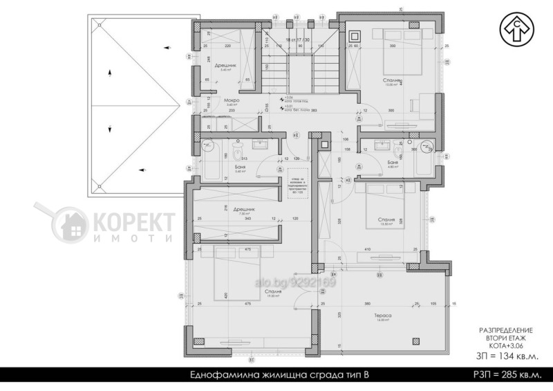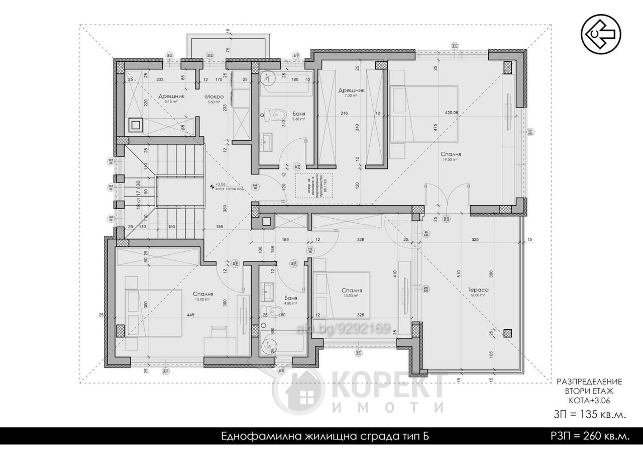 Втори етаж - дрешник, мокро помещение, баня и тоалетна, тераса и три спални, като в едната има голям дрешник и голяма баня и тоалетна.