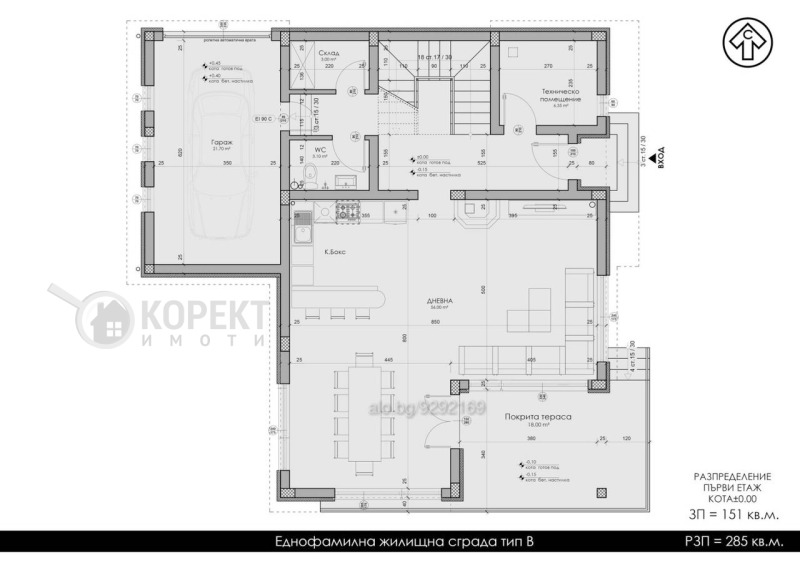 Първи етаж - дневна, трапезария, кухненски бокс, техническо помещение, склад, тоалетна, покрита тераса и гараж.