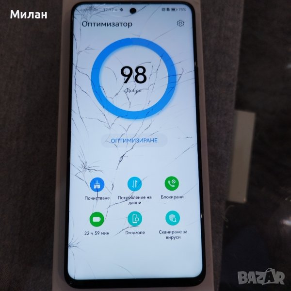 Продавам телефон Huawei nova 9se на части.Стъклото на телефона е счупено,дисплея работи,тъча работи,батерията издържа един ден с интензивно ползване на интернет.Задния капак е счупен.Всички части са налични и се предлагат и за повече въпроси питайте.Дисплей със средна рамка,основна платка-90лв,четирите камери-70лв,батерия-30лв.