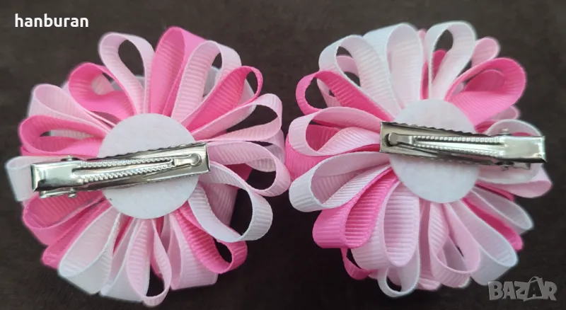 Страхотни панделки за коса от три цвята : бяло, розово и бледо розово. Диаметър е 7 см. Захващат се с фиба. Цена за комплект от два броя - 8 лв.