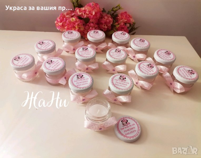 свещи в украсено бурканче подаръчета за гостите на бебешка погача → Обява 44104234