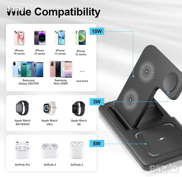 Apple Watch едновременно. С 15 W бързо зареждане за вашия iPhone, 5 W за AirPods и 3 W за вашия Apple Watch и оборудван с 25 W USB-C щепсел и 1-метров кабел, той е идеален за бързо зареждане, особено за серията iPhone 15. Насладете се на спокойствие с Qi-сертифицирана безопасност, предлагаща защита срещу свръхток, свръхнапрежение и други, докато отворите за разсейване на топлината и нехлъзгащият дизайн подобряват сигурността. Персонализирайте изживяването си при зареждане с разнообразни ъгли, от 0° до 45° или 55°, поддържайки както пейзажен, така и портретен режим. Компактен и преносим, той е подходящ за дома, офиса или пътуване. С универсална съвместимост, той поддържа широка гама от устройства, включително най-новите iPhones, серия Samsung Galaxy, Google Pixel, HUAWEI, iWatch 9/8/7/6/5/4/3/2/SE и AirPods 2/3 /Pro, което го прави универсално решение за зареждане.