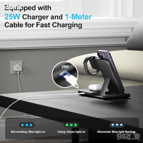 Изпитайте удобството на нашата 3-в-1 безжична станция за зареждане, предназначена да зарежда вашия телефон, AirPods и