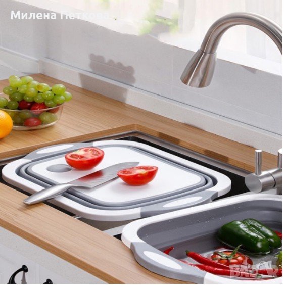 Многофункционалната сгъваема дъска за рязане може да се сложи на мивката като вана, идеална за измиване и рязане на всички видове плодове, зеленчуци, салати, месо или риба.