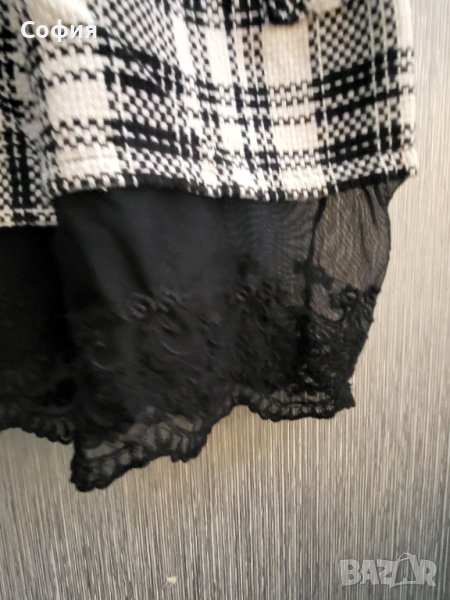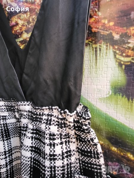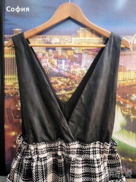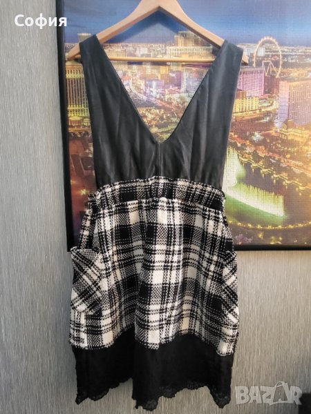 Елегантна рокля тип сукман. Горната част е тип потник и е кожена. Надолу е актуален принт с копчета и джобове. Отдолу с дантела.
