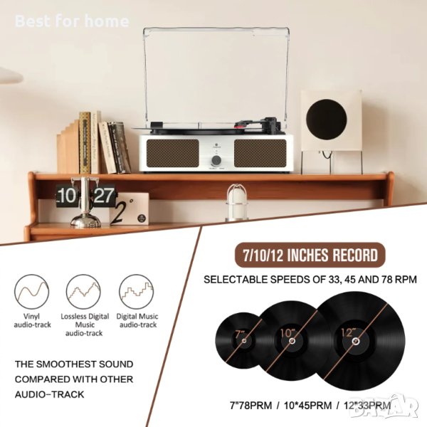 【ВИНИЛ ПЛЕЪР】 Грамофон с три скорости (33, 45, 78 RPM) възпроизвежда всички ваши 7" 10" 12" винилови плочи.