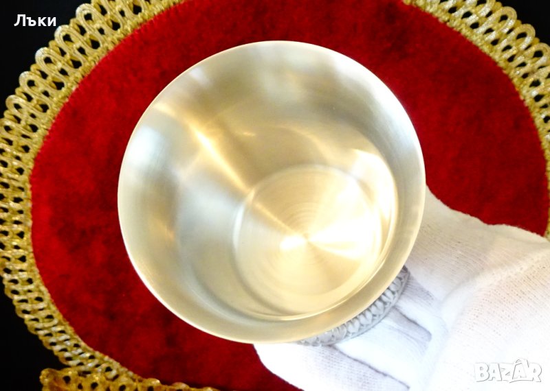 като сребърна.Височина 9 см.,диаметър 8.5 см.,тегло 200 гр.Вместимост 250 мл.