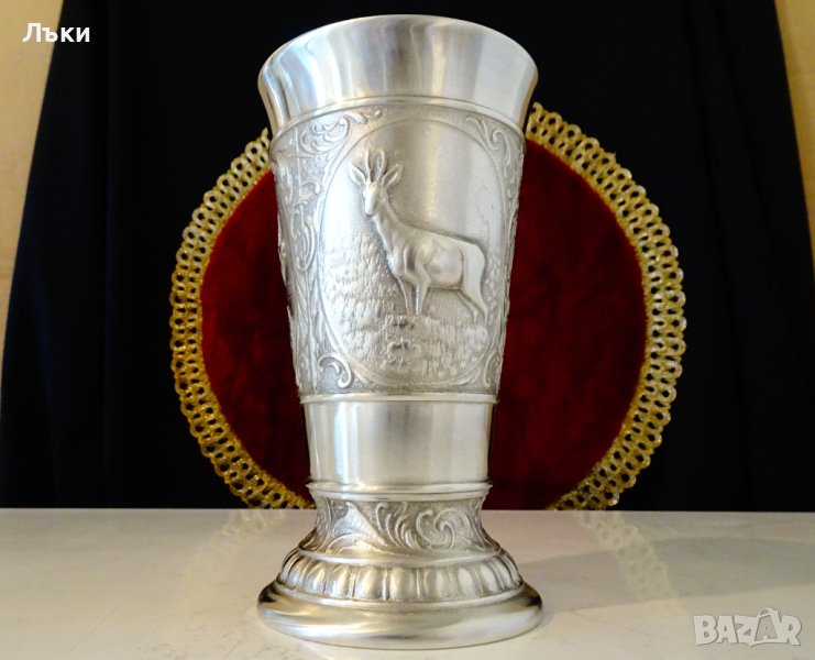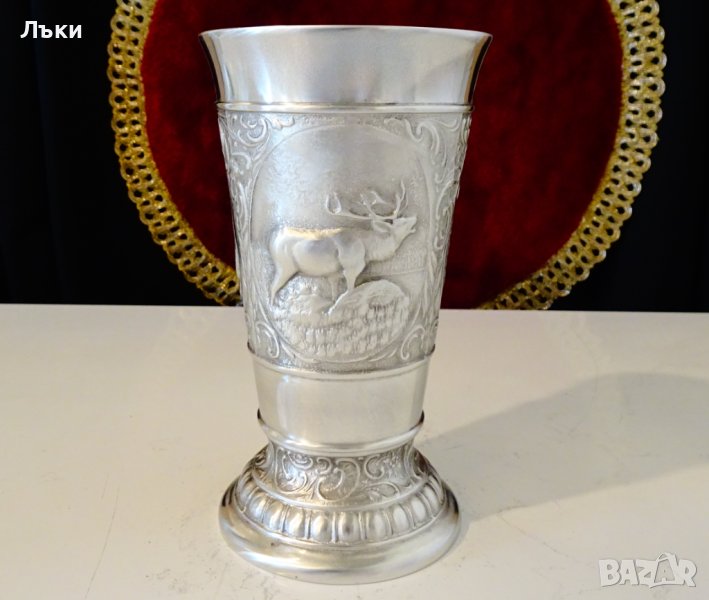 Старинен немски бокал,чаша за вино,халба,майсторска ръчна изработка от 95% калай и 5% сребро,маркиран.Величествен дизайн с красиви ловни картини - Елен в любовен период,млад Сръндак и горд Ловец - ухажор.Всяка картина има разкошна рамка от релефни барокови орнаменти.Високо качествена