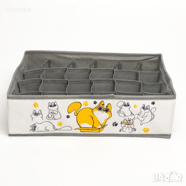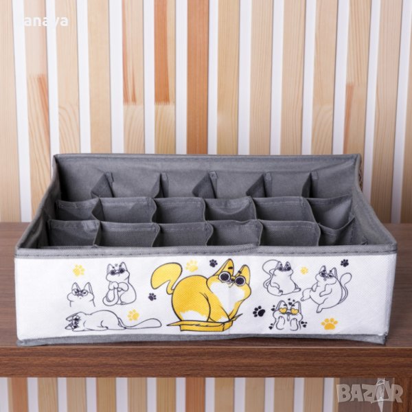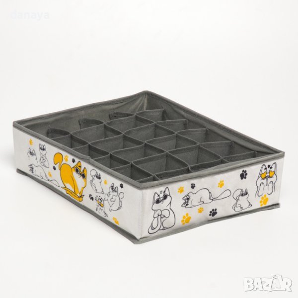 Сгъваема кутия за съхранение на чорапи, бельо, шалове и други дребни аксесоари. Текстилен органайзер за гардероб, чекмедже, шкаф, органайзер за под леглото. Органайзерът е сгъваем и лесно преносим, което го прави подходящ и за пътуване. 24 отделения.