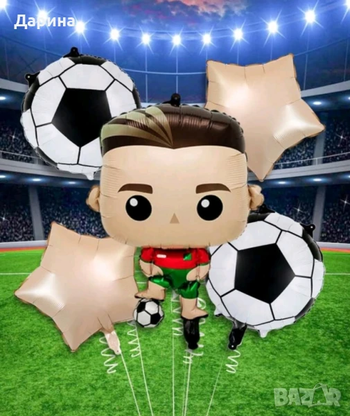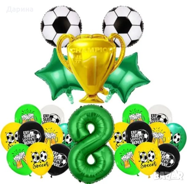 Парти сет балони Футбол: к-т от 5бр. фол. балони - 20лв. /10.23€. ( с възможност за цифра 80см.). Парти сет балони Футбол: 5бр. фолиеви балона - 1бр. купа, 2бр. топка и 2бр. звезди, 16бр. лат. балона и 1бр. цифра 80см. от 6 до 14г. -35лв./17.90€. Банер ,, Happy Birthday" - 15лв./7.67€. Покривка - 9лв./4.60€. Нови.