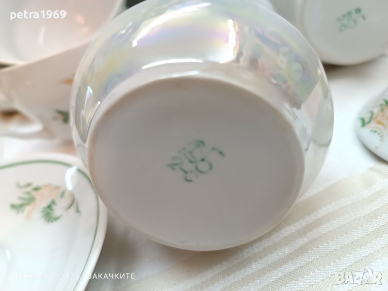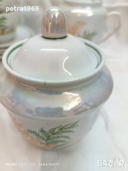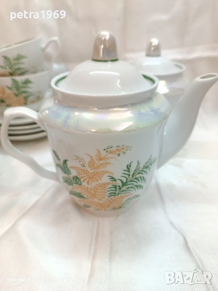 Барановка. Чайник, каничка, захарница, 5 чинийки и 4 чаши на Барановский фарфоровый завод, от периода 1970 - 1991 г. Чашите побират по около 220 мл., чинийките са с диаметър 14 см. Чайникът побира около 600 мл. и е висок 15 см., захарницата си е много голяма висока е 14 см. Чайникът, каничката и захарницата имат седефена лента за разкош. Съдовете са в чудесно състояние, само една чаша има чукване на отвора, а захарницата е с фабрична черта на периферията отгоре. Всички други са без наранявания, а цветовете, рисунъкът, гланцът, кантовете, ..., им са съвършено запазени. Цена за всички съдове заедно - 3 идеални двойни сета, каничка, захарниЦа и чайник плюс наранена, но използваема чаша плюс още две чинийки - 70 лв.