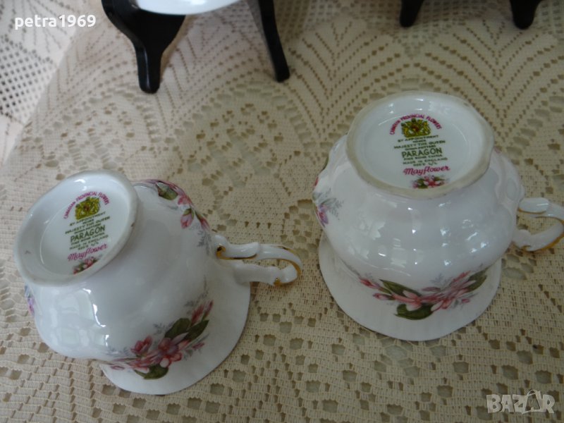 Tройни сетове "Mayflower" на PARAGON от серията Canadian Provincial Flowers. Чаша - височина 6,5 см., диаметър - 7,3 см., вместимост - около 150 мл. Чинийка подложна - диаметър 12 см. Чиния десертна - диаметър 15,6 см. Налични са 6 сета, 5 - те са идеални, шестият е с леко леко чукване на ръбчето на дъното на чашата отвън без да е пукнато, жълто фабрично петънце на подложната чинийка.