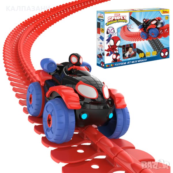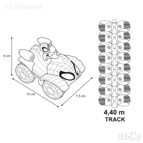 Мрежата Spidey е монтирана на фиксираща скоба, което дава възможност пистата да се фиксира към различни обекти.Комплектът включва: