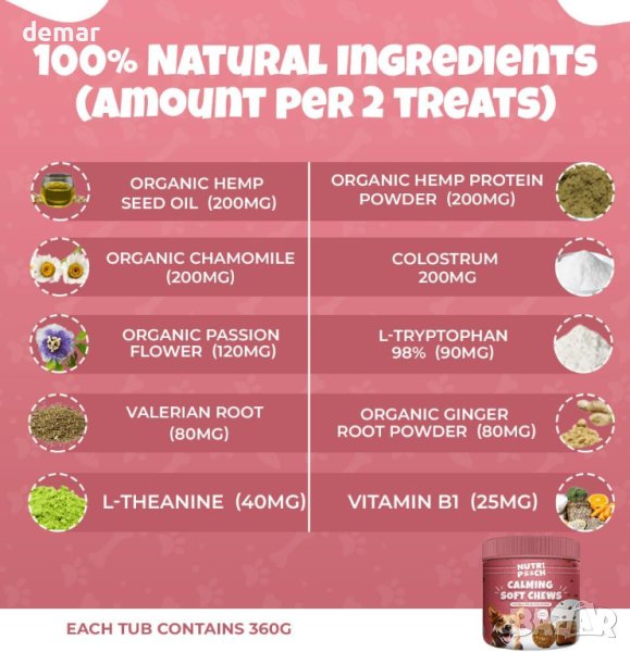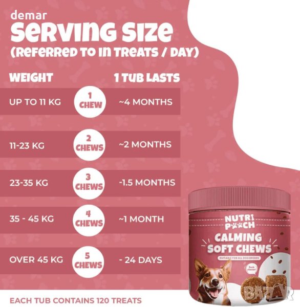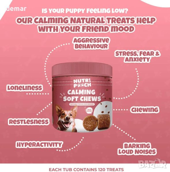 лайка за подпомагане на успокояващото поведение, намаляване на скачането, хапането и лаенето при кучета с агресивни или хиперактивни наклонности. Тези 100% натурални, GMP качество, без зърнени храни, без ГМО добавки за кучета дават приоритет на здравето на вашето куче, което води до по-щастливо и по-здраво кученце в рамките на 30 дни. С приятен патешки вкус и мека форма за дъвчене, тези успокояващи добавки създават изживяване за свързване на вас и вашия космат приятел, елиминирайки необходимостта да криете хапчета или прахове в храната им. Накарайте вашето куче отново да размаха опашка с тези ефективни и приятни лакомства.