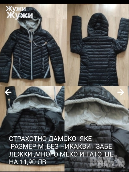 ДАМСКО ЯКЕ размер Л, без забележки , наситено черен цвят, има дадени размери, цена 11, 90 лв.. ДАМСКА двулицева грейка , размер М. джобове има и от двете страни, без забележки ,има дадени размери. цена 7,50 лв, Следва дамска грейка, размера Л, като нова , без никакви забележки, цена 6.90 лв. Жълта грейка, памук, размер М ,без забележки като нова ,цена 4.90 лв. Следва червена дамска грейка , без забележки, размер М ,на 4,50 лв.