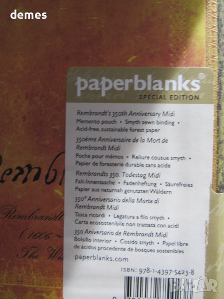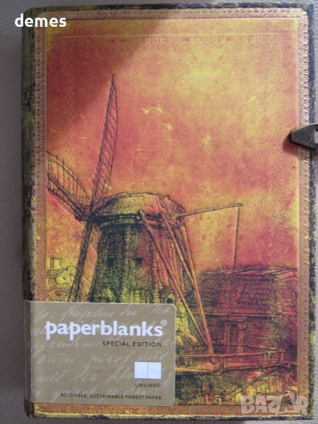 Тефтерът Rembrandt от колекцията Special Editions на Paperblanks е създаден в чест на eдин от най-великите художници в света Рембранд ван Рейн, за да почете 350-тата годишнина от смъртта му. Дизайнът е вдъхновен от една от картините на Рембранд, която изобразява вятърна мелница. Тефтерът е с твърда корица, изработена от рециклирани материали и се затваря с помощта на метална закопчалка. Включва 144 страници от устойчива хартия, без съдържание на киселини.