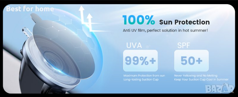 ТРИ опции за монтаж- за вентилаторната лрешетко или със здрава вакуумна вендуза. Вакумната вендуза може да се захване за прозореца или друга гладка повърхност. Има и допълнителен стикет- за повърхности които не позволяват вакуум.