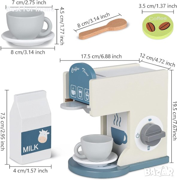 Комплект за кафе за деца - Този комплект за кафе играчка съдържа висококачествена дървена кафемашина*1, филтър*1, чаша*2, лъжица*2, кутия за мляко*1, кутия със захар*2, капсула за кафе*4.