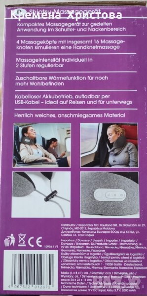 Компактен уред за масаж за целево приложение в областта на раменете и шията.Има 4бр. масажни глави с общо 16 масажни възела симулират истински ръчен разтриващ масаж.Интензивността на масажа може да се регулира в 2 степени.Има възможност за допълнително включване на загряваща функция за отпускане.Безжичен уред за зареждане, може да се зарежда чрез USB кабел- идеален за пътувания и когато сте на път.