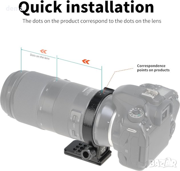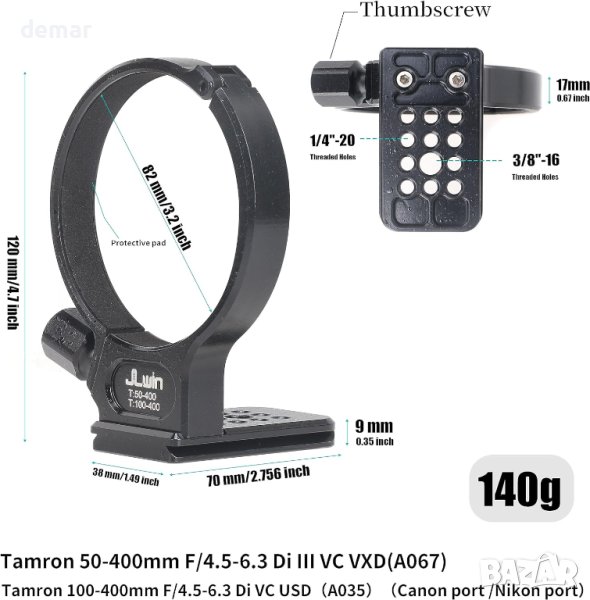 Тази яка за статив за обектив е съвместима с обективи Tamron 50-400 mm и 100-400 mm за байонети на Canon/Nikon. Той разполага с Arca-съвместима лястовича опашка за лесно закрепване към сферични глави, скоби или панорамни глави на Arca-Swiss стандарт. Освен това има 1/4" и 3/8" отвори за винтове в долната част за директно закрепване към статив. Пръстенът на триножника е изработен от лек авиационен алуминий, CNC машинно обработен с кух дизайн и завършен с повърхностна анодизация. Пакетът включва една яка за статив за обектив за допълнителна стабилност и гъвкавост на вашето фотографско оборудване.