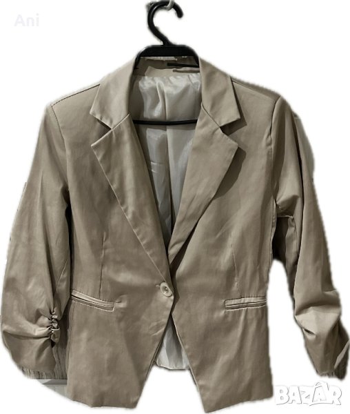 Комплект 1: Дамско сако в цвят беж (пясък) с ластици на ръкавите и ватки на раменете.