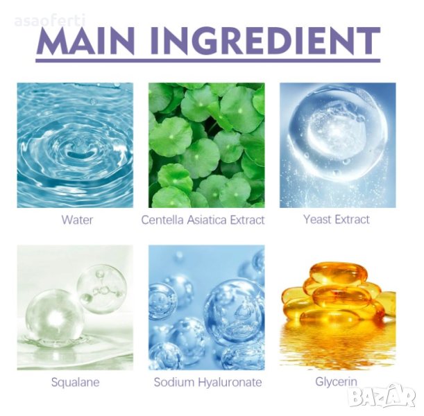 Състав: вода, екстракт от центела азиатска, екстракт от мая, сквалан, натриев хиалуронат, глицерин