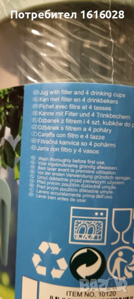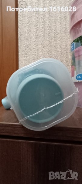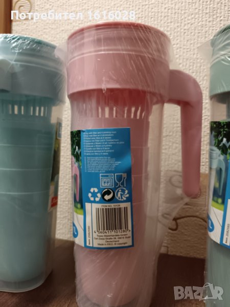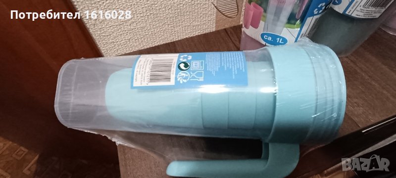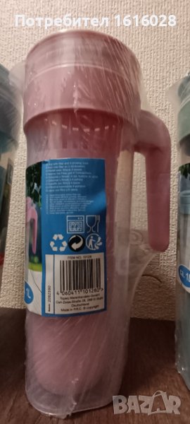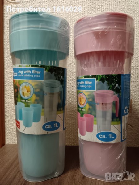 Кана за вода,чай,сок прозрачна с капак,вместимост 1 литър,с 4 чаши в нея. Изработена от безвредна пластмаса. Каната е тясна, така че се побира във вратата на хладилника,в багажа при пътуване или раница при поход.