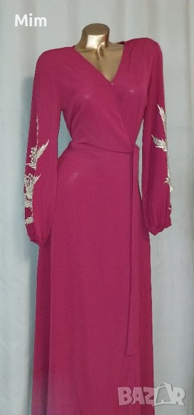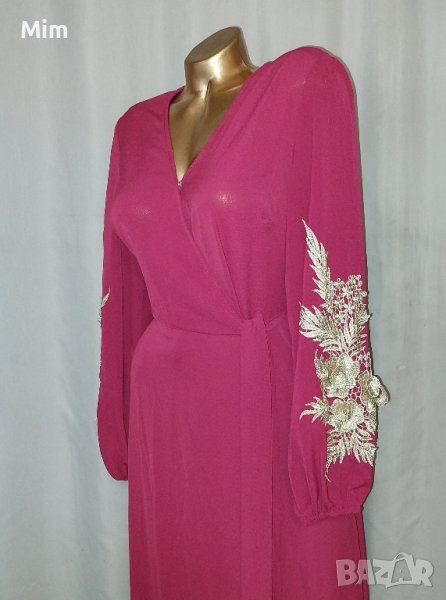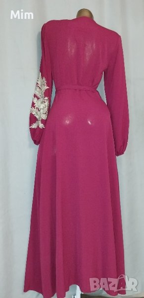 Дълъг халат с зашита брокатена, златисти, рязана бродерия на двата ръкава ,закопчаването е с копче тик так на бюста и се завързва с колан с премятане . Подгръдна 49 см едностранно, талия 37 см едностранно ханш 70 см едностранно, дължина 150 см ,премятане 20 см .Няма забележки.