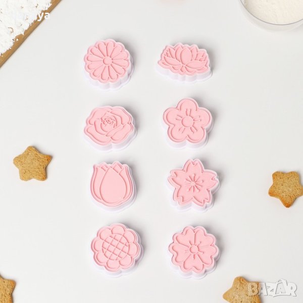 Комплектът включва 8 броя щампи + резци с форми на цветя.