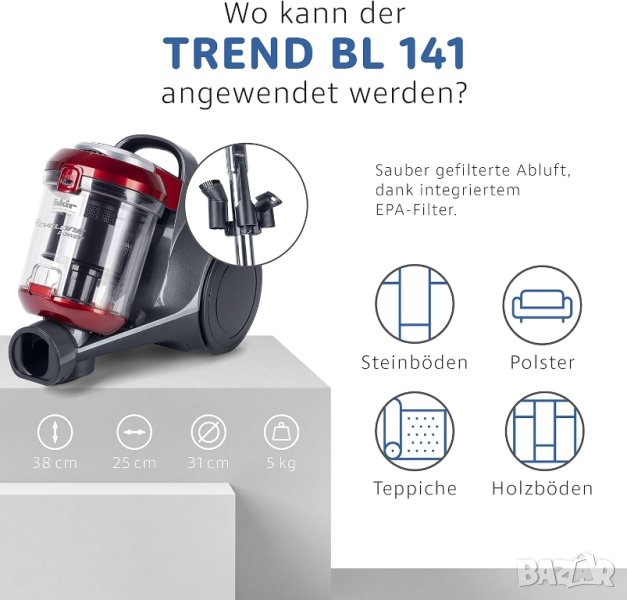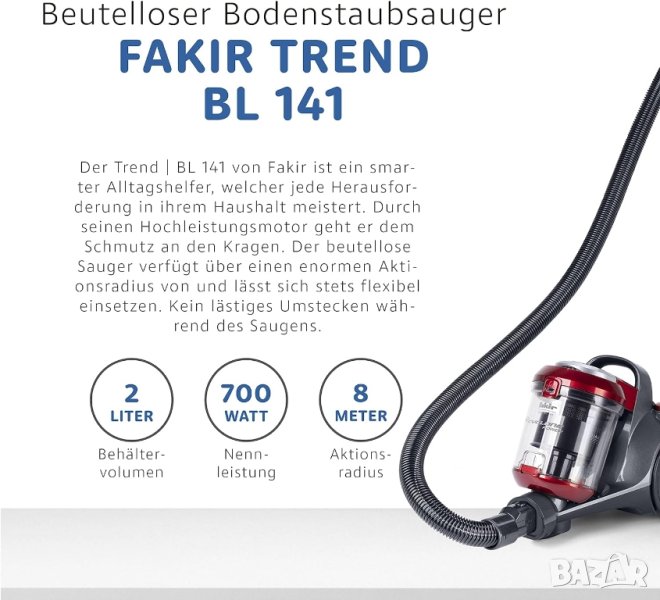 Fakir trend | BL 141 е малкият помощник, който смело се бори с ежедневните задачи за почистване. С помощта на мощния и високоефективен мотор (700W) и големия обхват (8 м) винаги имате под ръка гъвкавостта на прахосмукачка без торбичка.