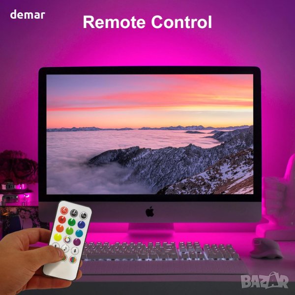 Подобрете атмосферата си със синхронизиращата музика LED RGB светлинна лента. С три предварително зададени музикални режима, които реагират на околния звук, той ви потапя в динамично светлинно изживяване. С осем живи динамични режима, тази светлинна лента, захранвана чрез USB, трансформира вашия работен плот, монитори, игрови конзоли, телевизори и др. Неговата подвижна основа подобрява гъвкавостта и можете да го управлявате без усилие, като използвате включеното инфрачервено дистанционно или бутони на борда. Не са необходими сложни настройки или WiFi – просто включете и пуснете за стабилна, приятна светлинна атмосфера.