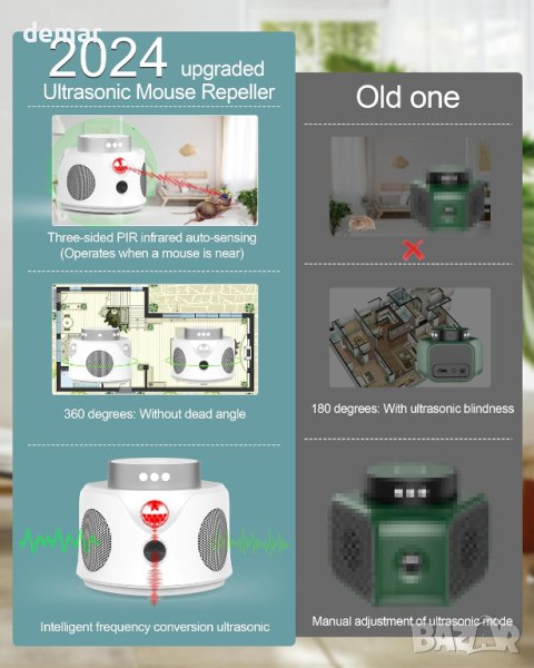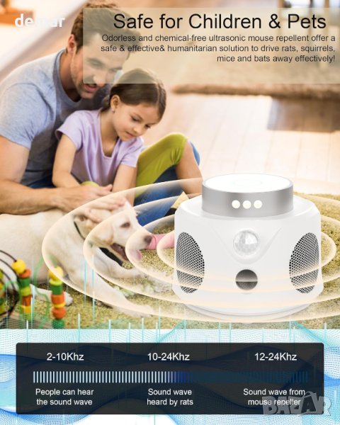 Модернизираният репелер за мишки 2024 използва модерна технология за ефективно отблъскване на гризачи като мишки, хамстери и катерици от различни среди, включително домове, складове, гаражи и тавани. Той използва ултразвук с променлива честота, PIR инфрачервени сензори и фенерчета, за да наруши нервната система на гризачите, което ги кара да се чувстват неудобно и ги прогонва. Този репелер покрива ефективен обхват до 349 квадратни метра и няма да безпокои вашите домашни любимци. Просто го включете в USB източник на захранване, включете го и го оставете да работи със своите 9 фенерчета и 3 високоговорителя, излъчващи ултразвукови вълни на 360 градуса за лесна и удобна борба с вредителите.