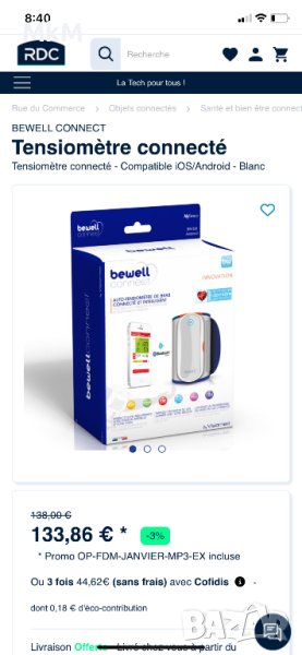 Автоматичен апарат за кръвно налягане за горната част на ръката с функция Bluetooth помага за автоматично измерване на кръвното налягане и пулса. Той прави серия от 3 последователни и автоматични измервания (интервали от 15 секунди) с автоматично изчисляване на средното артериално измерване, което позволява по-надежден резултат. Има технология за измерване на надуване (осцилометрична система), която открива количеството въздух, което маншетът трябва да измери. Данните се изпращат чрез Bluetooth към мобилното приложение. Открива аритмия или изчислява средните стойности сутрин и вечер за последните 7 дни.