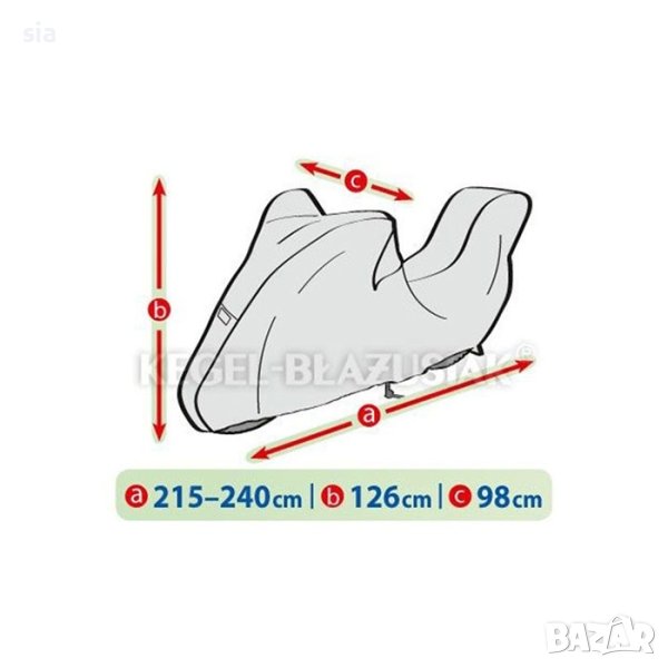 Всесезонен продукт.Предпазва от: Сняг, замръзване, дъжд, вятър, листа, дървесен сок, UV лъчи, птици, цветен прах и още много др.Вътрешната мембрана е мека и няма да надраска боята на превозното стведство.Покрива цялото превозно средство.Лесен за съхранение и транспортиране - не заема много място.Множество механизми за закрепване към мотора - ластична лента, връзки.