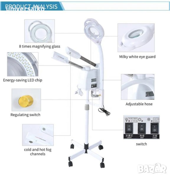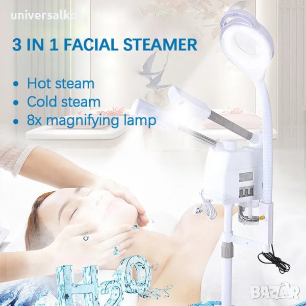 - Професионален уред за пара 3 в 1: дизайн с двойни дюзи и 8X увеличителна LED лампа. Топла мъгла: отваря порите и почиства в дълбочина; Студена мъгла: свива порите и заключва хидратацията.