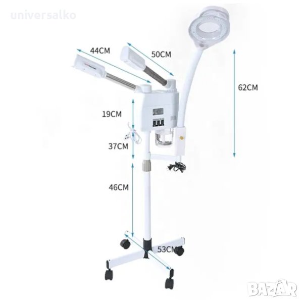 Пароозонатор 868A разполага с два отделни въртящи се накрайника за топла и студена пара, осигуряващи максимално удобство при работа. Стойката е с монтирани колелца, за лесно преместване.