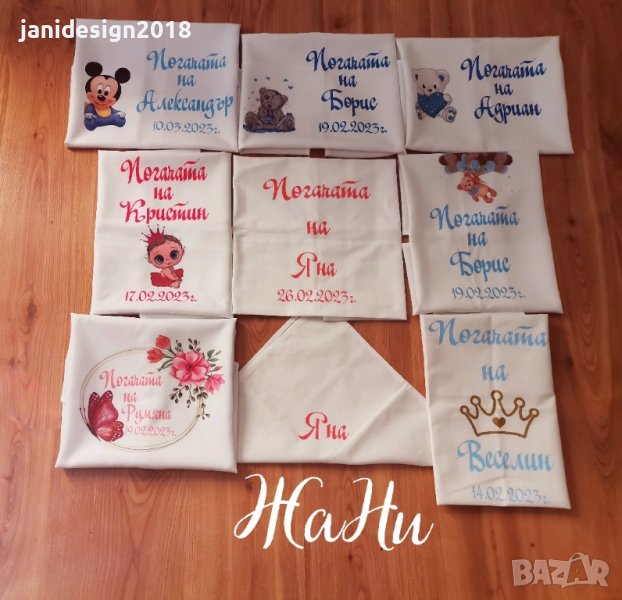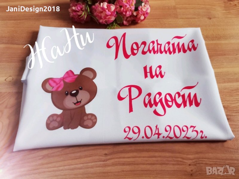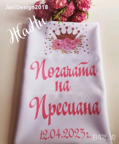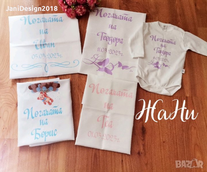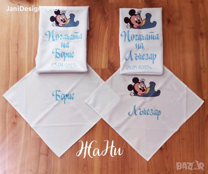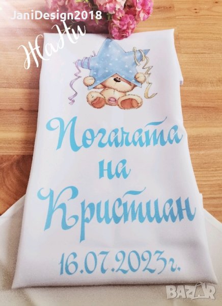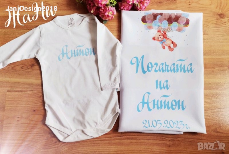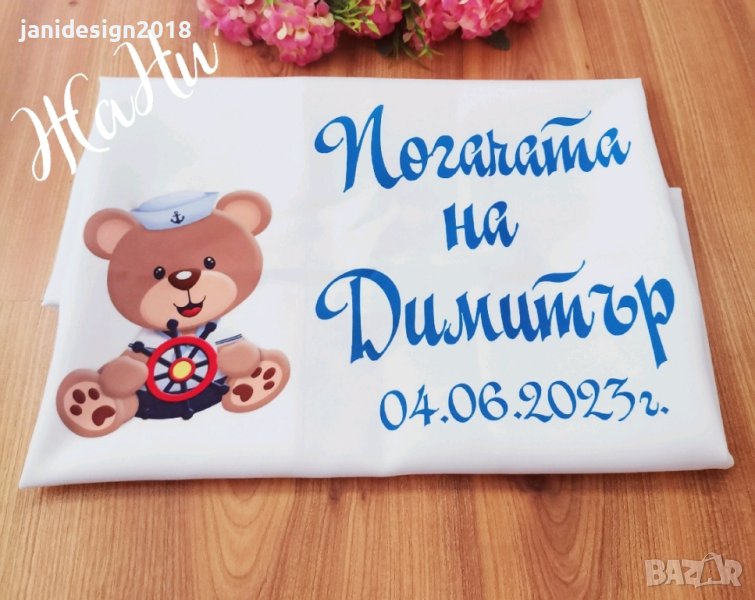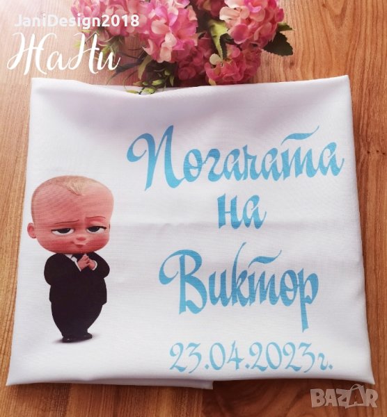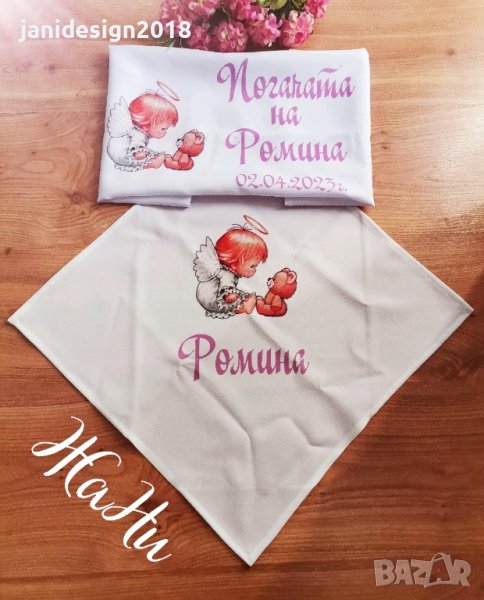 Месал за разчупване на питката с името на детето и датата на празника за бебешка погачаКъм него може да се добави малка кърпичка за паричките с име и боди с име и дизайн съобразен с темата на празника