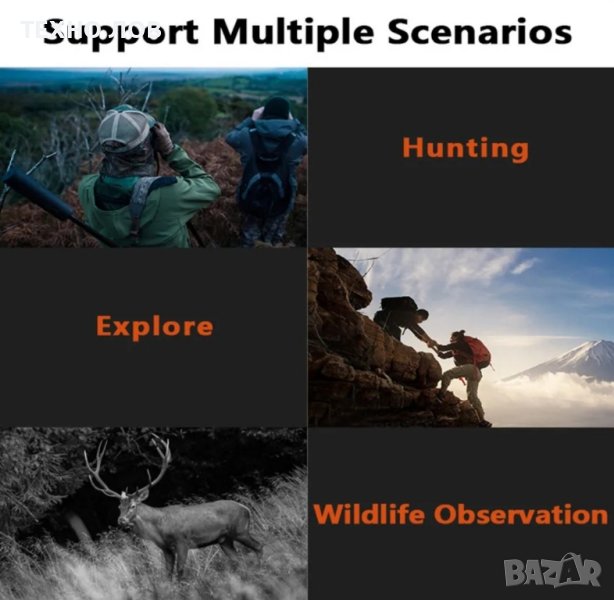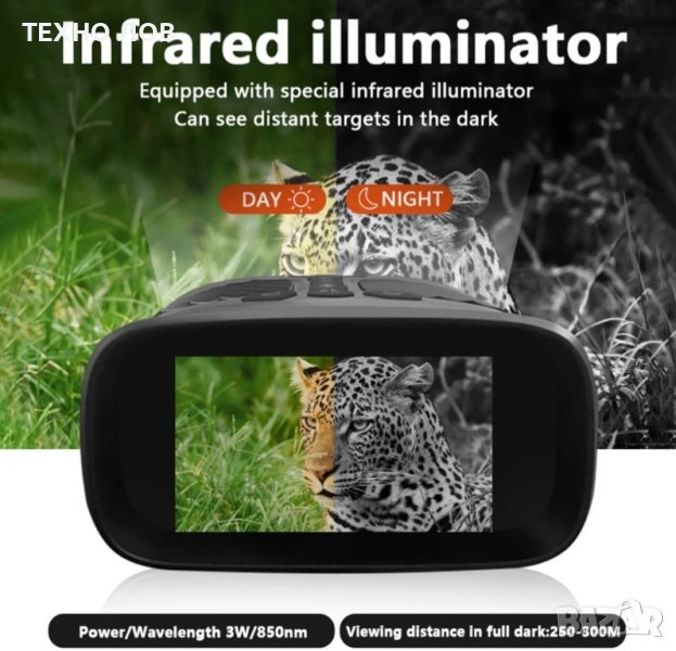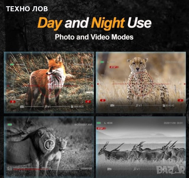 Бинокълът за нощно виждане е снабден с регулируем инфрачервен осветител със 8 нива на 850 nm, а оптичната система ви позволява да виждате ясно животните на тъмно или при слаба околна светлина. Три режима на работа: правене на снимки, запис на видеоклипове и възпроизвеждане, с които можете да правите снимки и видеоклипове с висока разделителна способност и изключителна оптична яснота както през деня, така и при слаба светлина или през нощта.