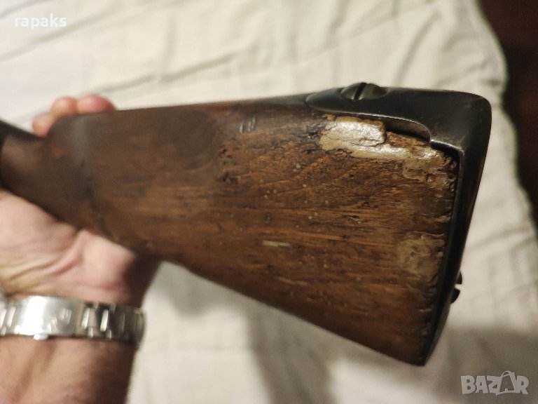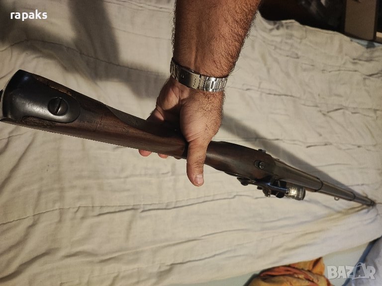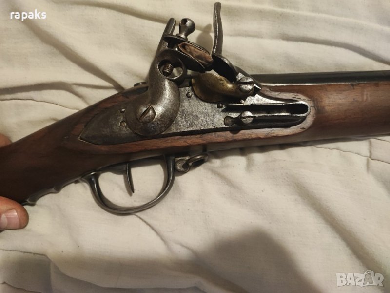 Продавам прекрасна автентична английска кремъчна пушка, Кремъчен мускет в клекционерско и много рядко визуално и техническо състояние. Само цевта до тапата е 114см. Цевта е проводима и механизмите работят, но е с нов шомпул. Дървото е здраво, но има отчупено в зоната на затилъка Оригинал не реставриран и дори не почистен. Прекрасна украса за стена, колекция и реставрация.