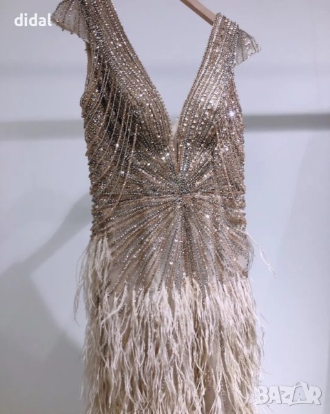 Великолепна рокля с хиляди ръчно нашити кристали, пайети мъниста и щраусови пера